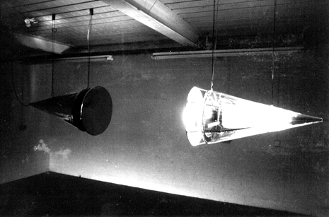 The installation depicted above, an experiment in evoking the fourth dimension, makes use of resonant sound and slowly oscillating lights under electronic control to create the effect of objects changing from transparent to solid and reflective (the cones) and a sound space that appears to be sculptural, in that the resonant effect causes nodes of sound to be located in space, thus the viewers sensory impression of reality continually changes in both time and space.