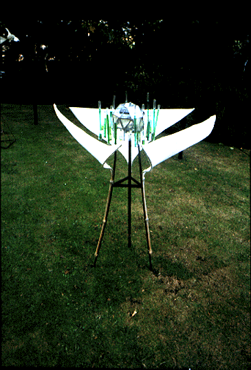 Amelia is a sunpowered kinetic sculpture. Sunlight falls on a solar panel which drives a hidden motor that slowly rotates the central construction causing reflections and refractions of sunlight to play on the three white wings.